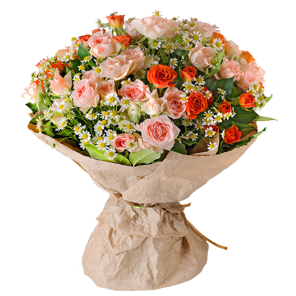 Роза кустовая микс, ромашки полевые, зелень.