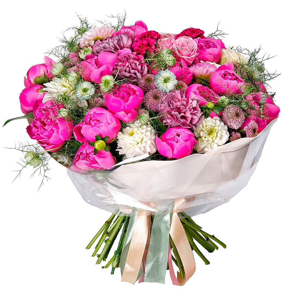 Пионы, декоративная зелень, гвоздики, хризантема.