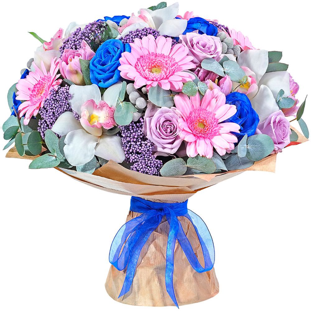 Роза синяя, гербера, орхидея, роза одноголовая, бруния, гипсофила, эвкалипт.