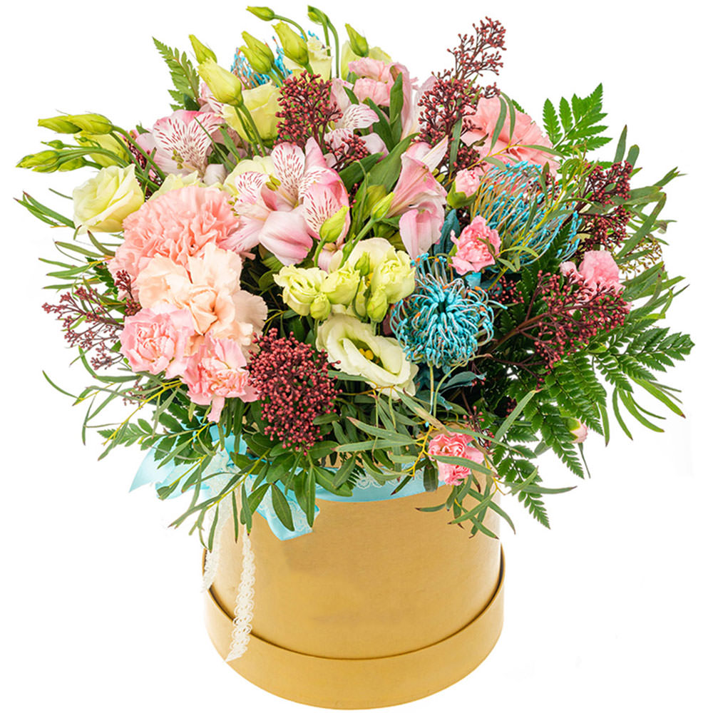 Гвоздика, эустома, альстромерия, скимия, крашенный леукоспернум, фисташка.